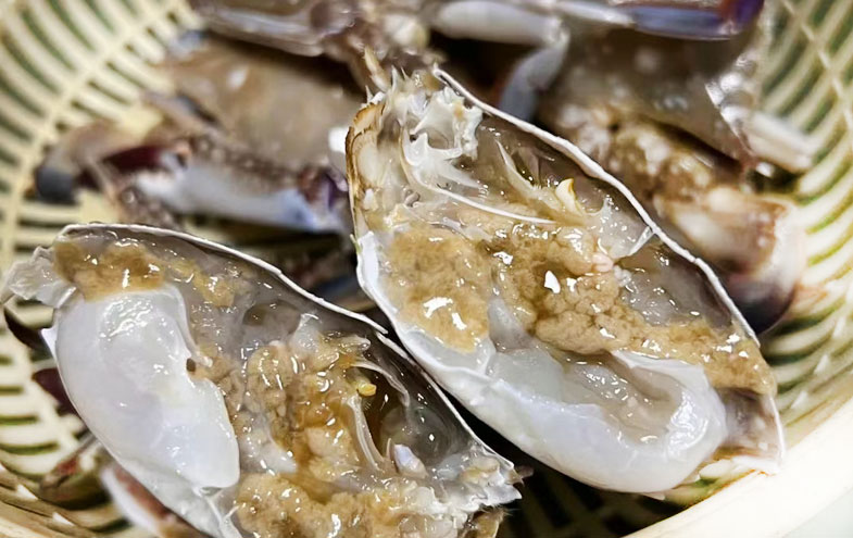 捏厚度:蟹壳两侧"梭子"部位饱满无凹陷,蟹腹白而紧实。