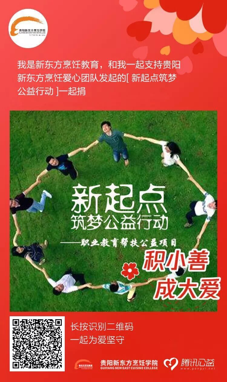 今天,由中国社会福利基金会、腾讯公益联合新华教育集团开展的“新起点•筑梦公益行动”职业教育帮扶公益项目正式开启。上午九点,贵阳新东方烹饪学院也正式启动“同心携手,为梦献爱:新起点•筑梦公益行动”项目活动。 活动现场,我校3000余名师生齐聚操场,井然有序,一一为贫困学子献上爱心。启动仪式共筹得善款53115.5元(其中,我校“产教融合定向班”合作企业苏州老阿爸餐饮管理有限公司捐款3000元),为期三天的募捐活动预计将筹集善款12万元。这笔善款将用于资助贵州省30名贫困学生,为他们提供职业技能培训,让他们也能走进校园学习。