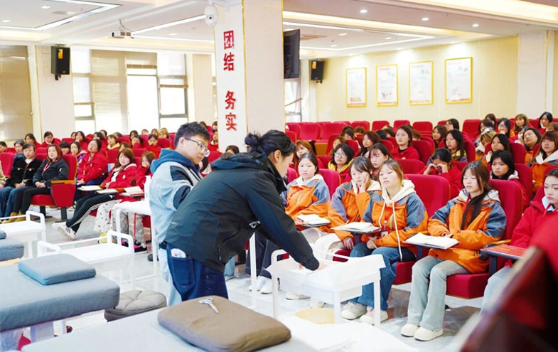 张老师热情邀请同学们轮流上台,在模拟真实工作场景中进行实操演练。她耐心地在每一位同学身边驻足,进行“一对一、手把手”的精准指导,从操作姿势的调整到手部力度的掌控,及时纠正问题、点拨技巧。这种零距离的互动,让同学们得以将刚学到的理论知识迅速转化为肌肉记忆,实现了从“听懂”到“会做”的关键一跃。