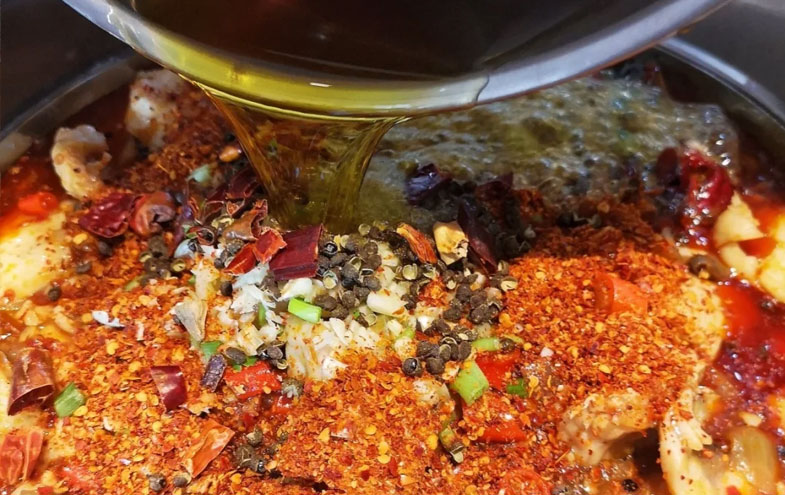 水煮鱼片的“辣”需与“麻”“香”平衡,通过炒料与汤底的搭配,构建出复合味觉。