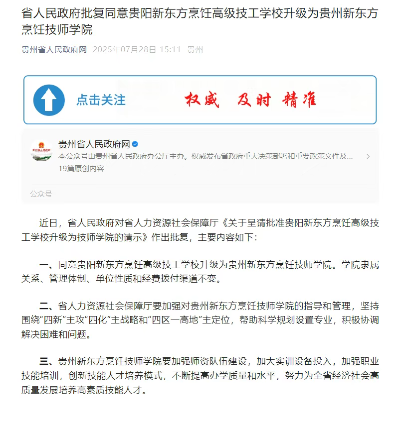 近日,经贵州省人民政府正式批复,贵州新东方烹饪高级技工学校顺利获批升格为贵州新东方烹饪技师学院。这是我校发展史上具有里程碑意义的一件大事,特与全校师生、家长及社会各界分享这一喜悦盛事。