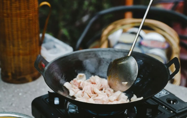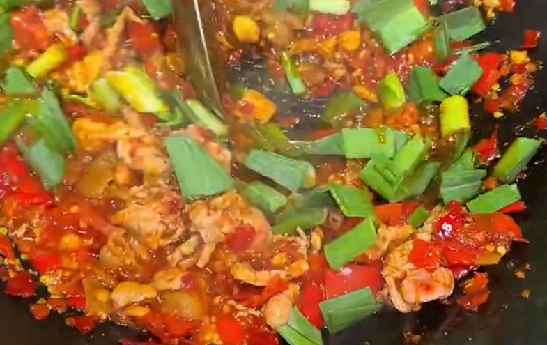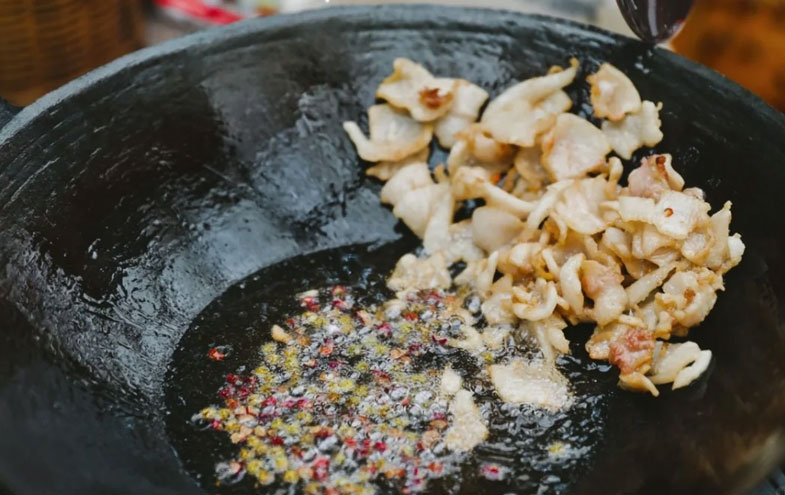地摊火锅的制作过程非常有趣。首先,新鲜的猪肉被现场称重,然后放入锅中煸炒。肥肉在高温下慢慢融化,释放出浓郁的肉香。接着,豆豉和糍粑辣椒被加入锅中,与肉一起翻炒,使得整个菜肴的味道更加丰富。