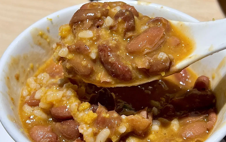 而豆米火锅最让人难忘的,莫过于收尾时的“隐藏吃法”——豆米拌饭。当涮菜吃得差不多,锅里还剩小半锅豆汤和豆沙时,端来一碗刚蒸好的白米饭,倒进锅里,用勺子将米饭与豆沙、肉丁、剩余的汤汁充分拌匀。米粒裹上了绵密的豆沙,变得油亮饱满,每一粒米都吸足了肉香与豆香,入口软糯扎实,没有多余的调料,却比任何炒饭都更让人满足。这是贵州人刻在骨子里的“光盘哲学”,也是对这锅慢炖出来的美味最彻底的尊重——不浪费一滴汤、一粒豆,把最后一丝滋味都装进胃里,才算完成一场完整的“豆米火锅盛宴”。