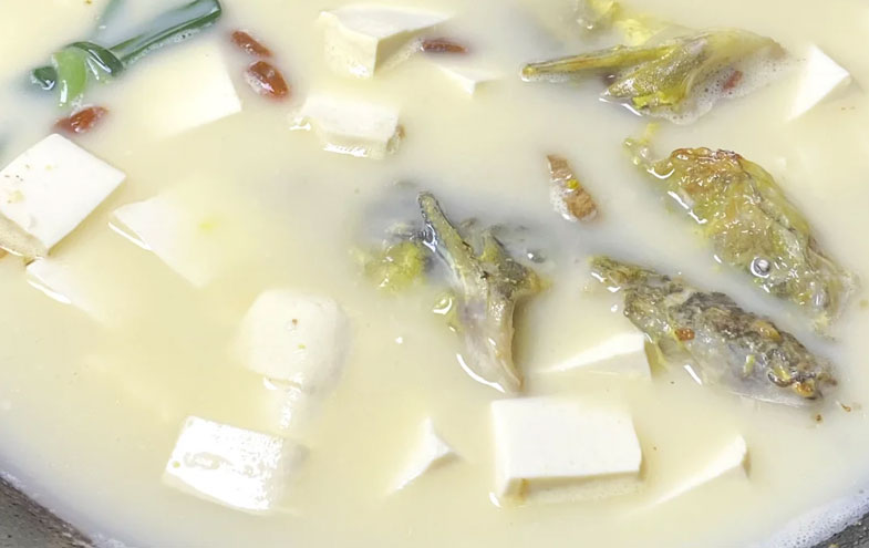 最关键的"奶白汤"秘诀在于"热油爆香后冲入沸水"。冷水会使蛋白质骤然收缩,汤色浑浊;唯有滚水冲入,才能瞬间激发鱼胶质的溶解,形成"胶质遇热膨胀"的物理反应。此时需盖锅盖中火慢炖,让胶质与豆腐的豆蛋白充分乳化,汤色自然呈现如牛奶般的乳白色。